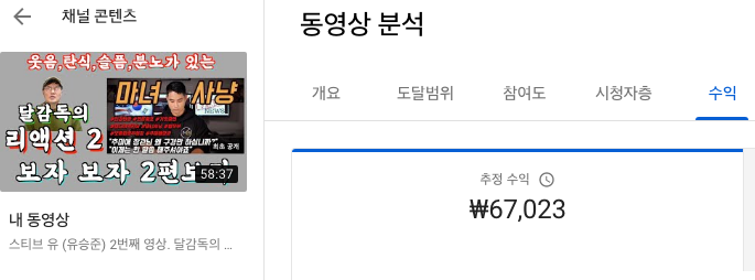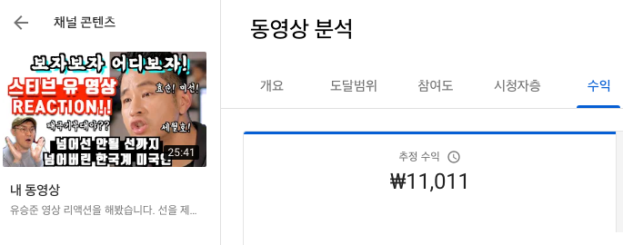 이 영상은 지금 조회수 글쓰는 날 기준으로 9.4만회를 기록했어요. 근데 돈이 왜 이것밖에 안되냐 하실텐데요. 원래 제 채널은 수익이 나는 채널이 아니었습니다. 그런데 이 영상으로 조건을 충족해서 수익이 나기 시작했어요. 이 영상의 조회수가 8만이 넘어가면서 수익이 창출되어 실제로 1만 조회수가 조금 넘는 수익이 모인 겁니다. ㅎㅎ